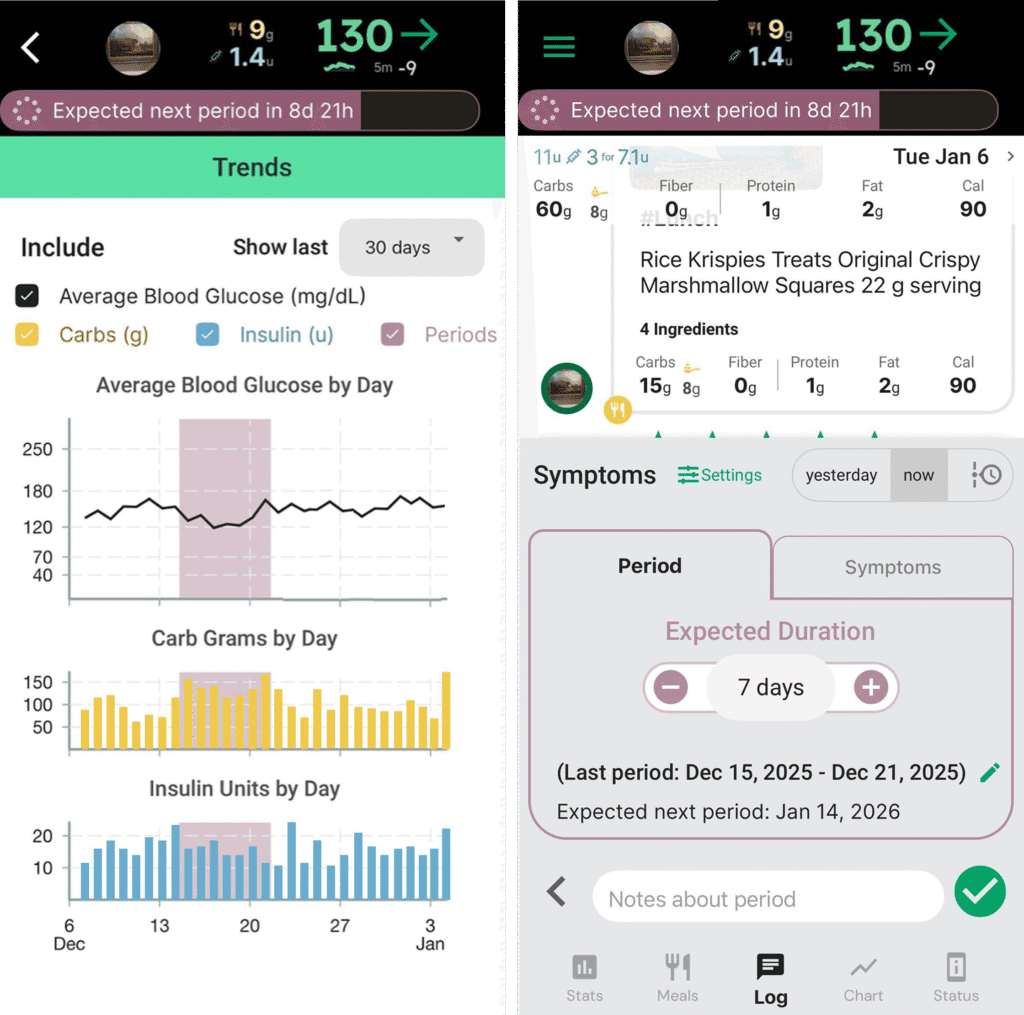 Having all of this data in one place can make these patterns easier to spot. In Gluroo’s new menstrual tracking feature, users can log their periods. You can overlay this period data with your blood sugar, insulin, and carbs over the past 7-90 days to see how they may be connected.