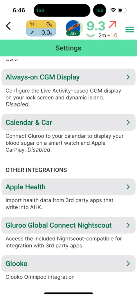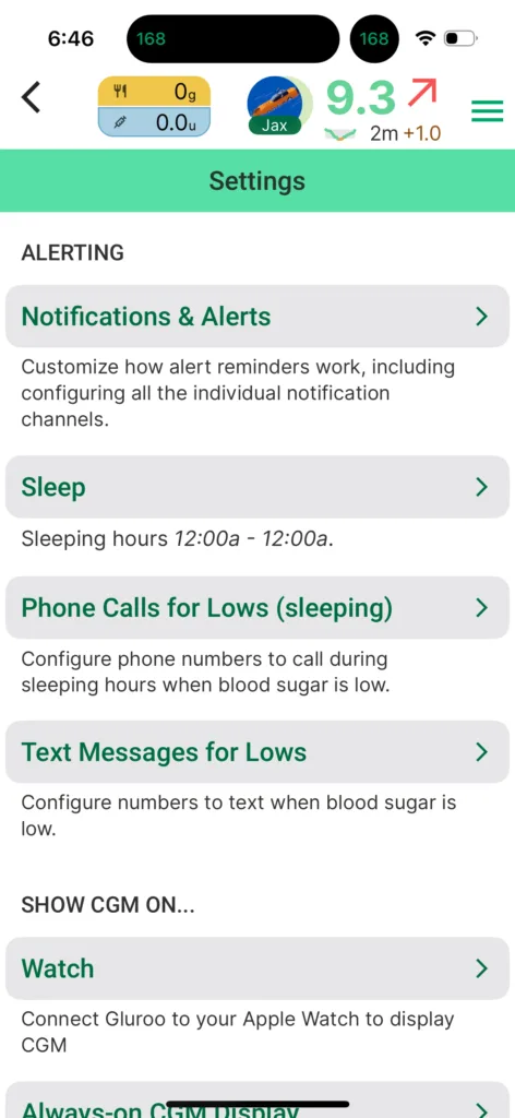 The big new thing is a complete rework of Gluroo’s settings. Now almost everything that could be thought of as a setting is in the settings menu instead of spread about the app. There are descriptions for each setting screen that the main list will navigate you to. We especially want your feedback on this change. Our goal was to make it both easier to find and understand settings, and also to make it easier to understand the breadth of functionality available. On iOS the settings are made to be much more similar to conventional settings on that platform: