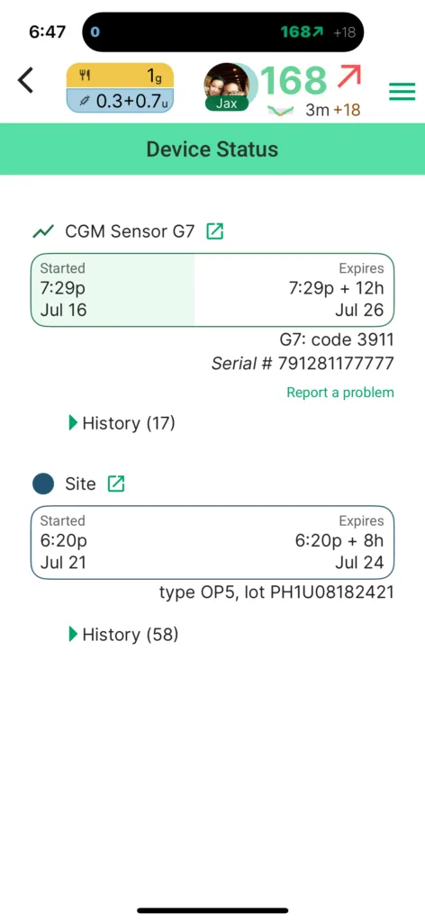 - Menu > Device Status now has a more verbose description of the active CGM, Pod/infusion set, vials, etc., including a history of the recent other devices. Reporting failed CGMs to Dexcom with autofill should be working again.