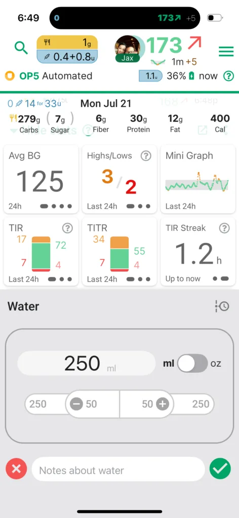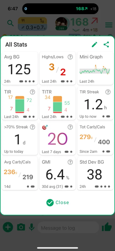 - Changed Stats cards: Avg Carbs and Avg Bolus are now combined into 1 card; Tot Carbs and Tot Bolus are also now combined into 1 card. These show carbs + cals if you’re not using bolus insulin.