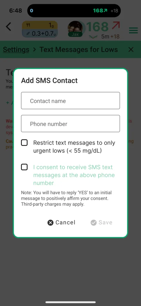 - SMS Texts can now be configured to be sent for low alerts (all day and night, not just during sleeping hours) to phones/devices that you have that may be incompatible with Gluroo (e.g., a feature phone) or for you to involve non-Glucrew emergency contacts that don’t need the Gluroo app installed. [alpha quality – do NOT rely on these]