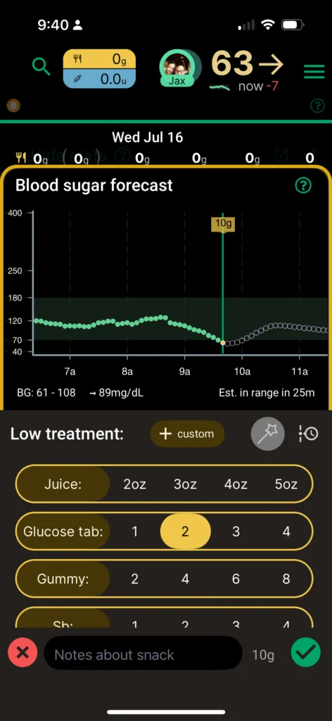 - Plus Menu > Sugar intervention snacks now have a magic wand button that opens a new extension tray showing the forecast effect of the intervention on blood sugar in chart form. This reduces the number of visible intervention snack rows you can see, so they’re now reorderable (use “+ custom” button) and scrollable. This makes it easier to edit/remove custom snacks, too. This and the custom snack reordering is available in the Settings screen, too.