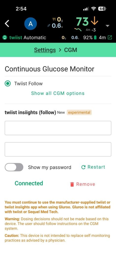 - Try hitting the “Restart” button on the right below your twiist insiight credentials under Menu > Settings > CGM.