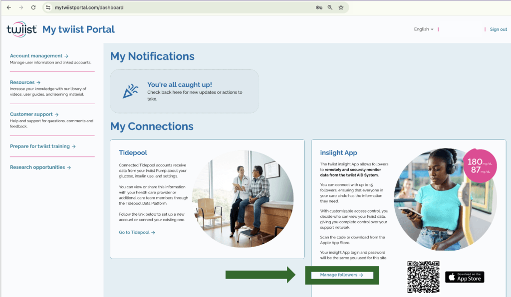 For the twiist pump Integration to work, you must connect Gluroo through a follower account you create for the twiist insiights app. You can set up this account in your My twiist Portal.